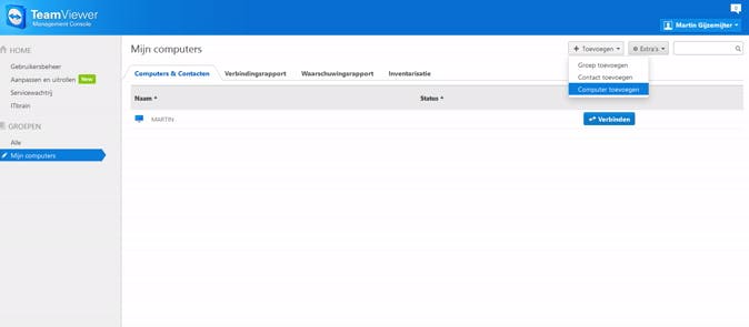Om altijd en overal in te kunnen loggen op een computer waar TeamViewer op is geïnstalleerd, dien je een account aan te maken. Klik op Ik heb nog geen TeamViewer account en vul de gegevens in die van je worden gevraagd. Eenmaal aangemeld klik je rechtsboven op Toevoegen / Computer toevoegen / Bestaand apparaat toevoegen. Start nu TeamViewer op je computer en kopieer het ID naar het veld TeamViewer-id op de website. Geef de computer een naam bij Alias, vul een wachtwoord in en klik op Computer toevoegen. De computer is nu gekoppeld aan je TeamViewer-account. Vervolgens klik je in TeamViewer op het potlood naast het veld Gebruik uw persoonlijke wachtwoord. Geef een wachtwoord in om ervoor te zorgen dat TeamViewer altijd toegang tot je computer kan verlenen.