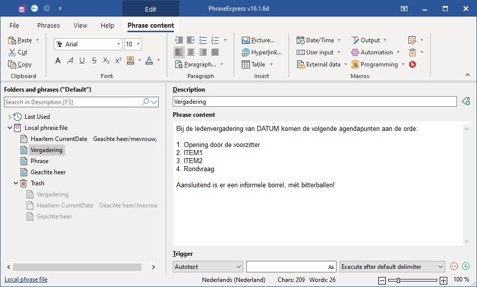 Open het venster en klik op New Phrase. Vul bij Description de naam Vergadering in en klik het vak Phrase Content. We voegen vervolgens wat tekst toe.