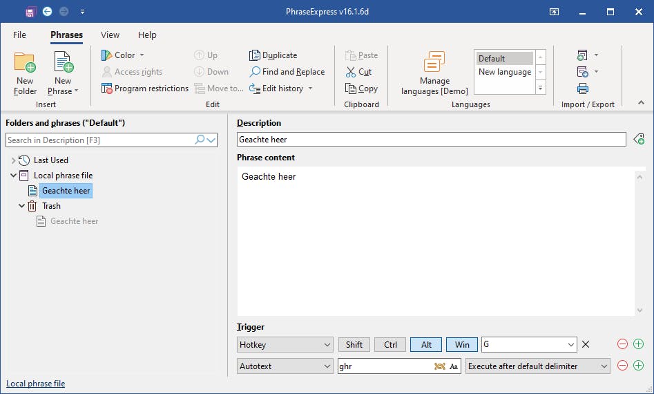 De methode om deze voortaan aan te roepen heet Autotext. Dat wil zeggen dat je een (ongebruikelijke!) lettercombinatie kunt invoeren om de tekst terug te halen. Dit is te vergelijken met het aloude steno. Wij kiezen de lettercombinatie ghr dat we invullen in het vak achter Autotext. Daarachter staat Execute after default delimiter. Dat wil zeggen dat PhraseExpress de vervanging uitvoert wanneer je na de lettercombinatie een van een aantal toetsen aanslaat, waaronder spatie, punt en komma.