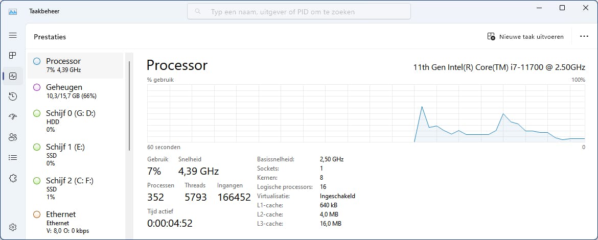 Hardware-virtualisatie Moderne processors bieden ondersteuning voor hardwarevirtualisatie, maar het kan zijn dat deze functie nog niet is ingeschakeld in je UEFI/BIOS. Om dit te controleren, open je Taakbeheer met de sneltoets Ctrl+Shift+Esc en ga je naar het tabblad Prestaties. Klik op Processor en kijk of de optie Virtualisatie ingeschakeld staat. Zo niet, dan moet je naar het UEFI/BIOS gaan. Om dit te bereiken vanuit Windows, houd je de Shift-toets ingedrukt terwijl je Afsluiten selecteert via de Aan/Uit-knop. Kies daarna voor Problemen oplossen / Geavanceerde opties / Instellingen voor UEFI-firmware. Bevestig met Opnieuw opstarten om zo in het UEFI/BIOS setupvenster te komen.