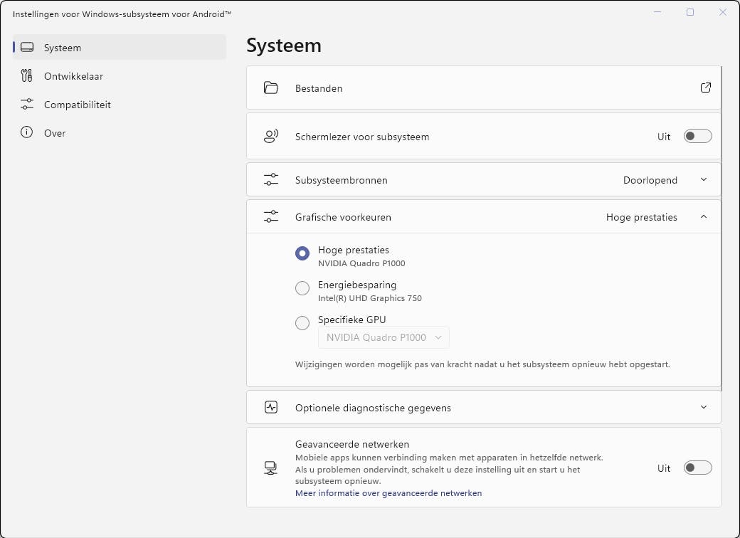 Zodra je android invoert in het startmenu, verschijnt Instellingen voor Windows-subsysteem voor Android. Open de app en stel bij Systeem de optie Subsysteembronnen bij voorkeur in op Doorlopend en Grafische voorkeuren op Hoge prestaties. In de rubriek Ontwikkelaar activeer je de optie Modus voor ontwikkelaars. Je kunt de emulator-configuratie nu afsluiten.