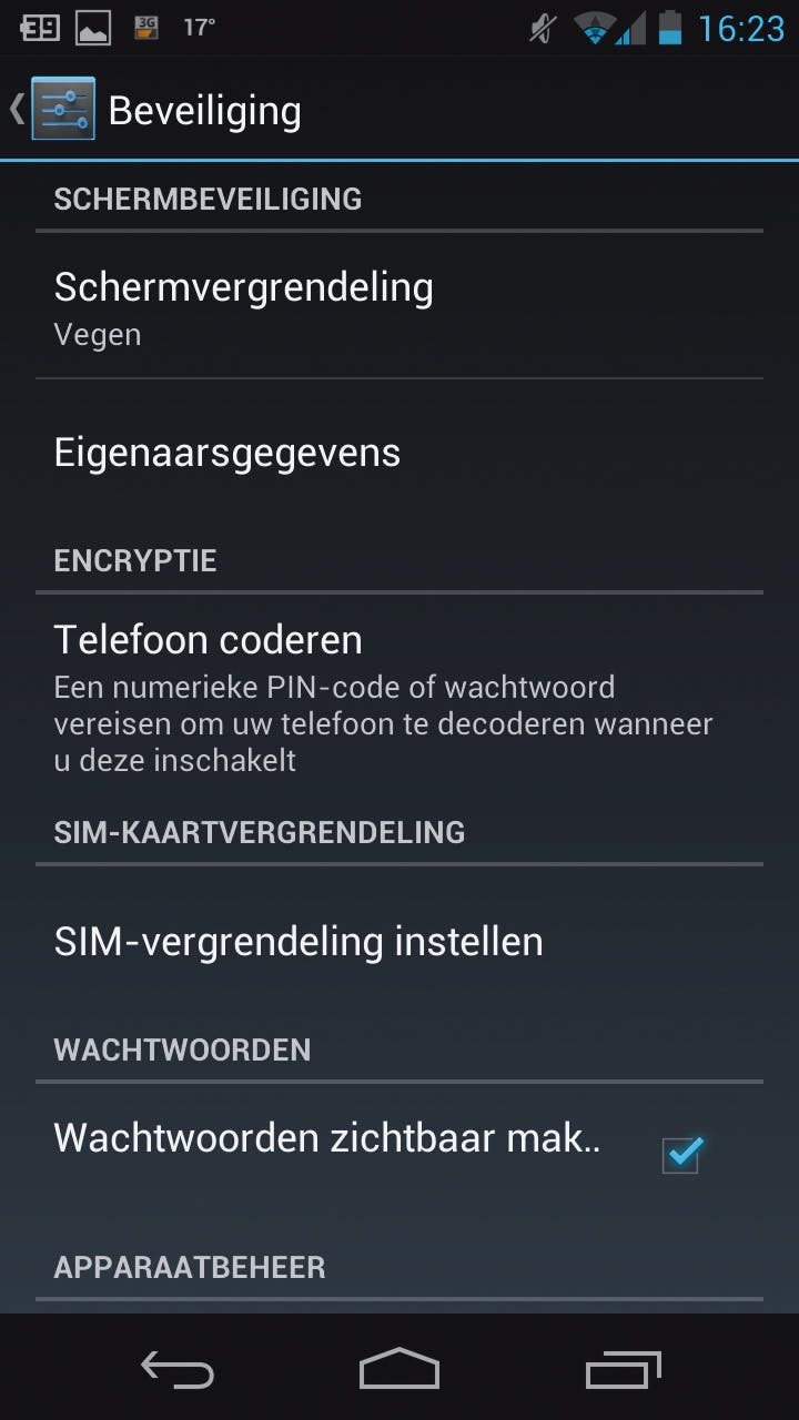 Alleen SIM-vergrendeling is niet genoeg, dus we gaan een stapje verder. In het menu Beveiliging vindt u de optie ‘Schermvergrendeling’ (afbeelding 3). U hebt hier de volgende opties: