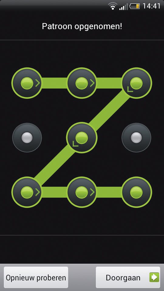 . Deze methode wordt veel gebruikt door mensen die een pincode onhandig vinden. Uw telefoon wordt ontgrendeld door met uw vinger een patroon te tekenen over een vlak met negen punten (afbeelding 5). Let op: een dief zou uw patroon kunnen achterhalen door de vingerafdrukken en vegen op het scherm te bekijken.