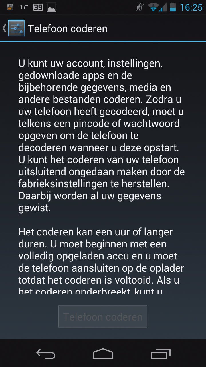 Encryptie betekent dat de inhoud van alle bestanden op uw telefoon onleesbaar wordt gemaakt voor mensen die het wachtwoord niet kennen. Dit is de beste manier om de data op uw telefoon ontoegangelijk te maken. Afhankelijk van de hoeveelheid gegevens op uw telefoon kan het versleutelen een uur of langer duren, dus hang uw telefoon voor de zekerheid aan de lader.