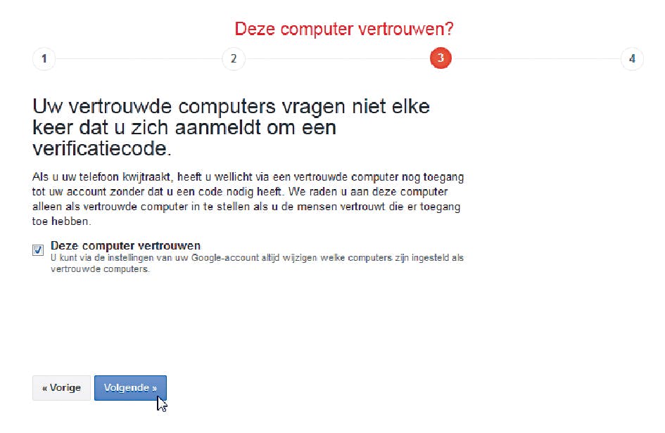 7. In het scherm van Stap 3 krijgt u nu een belangrijk onderdeel te zien, namelijk het bepalen van een vertrouwde computer. Mocht u uw telefoon kwijtraken, dan kunt u immers geen sms-berichten meer ontvangen. En die hebt u in het vervolg nodig om überhaupt in te kunnen loggen op uw Google-account. Neem voor die vertrouwde computer dus een pc die van uzelf is en niet voor iedereen toegankelijk is. Voor extra beveiliging zou u later zelfs nog een extra vertrouwde computer kunnen toevoegen. Klik op Volgende om te bevestigen dat u de computer waarop u nu de instellingen doet, wilt toevoegen als vertrouwde computer (afbeelding 8).