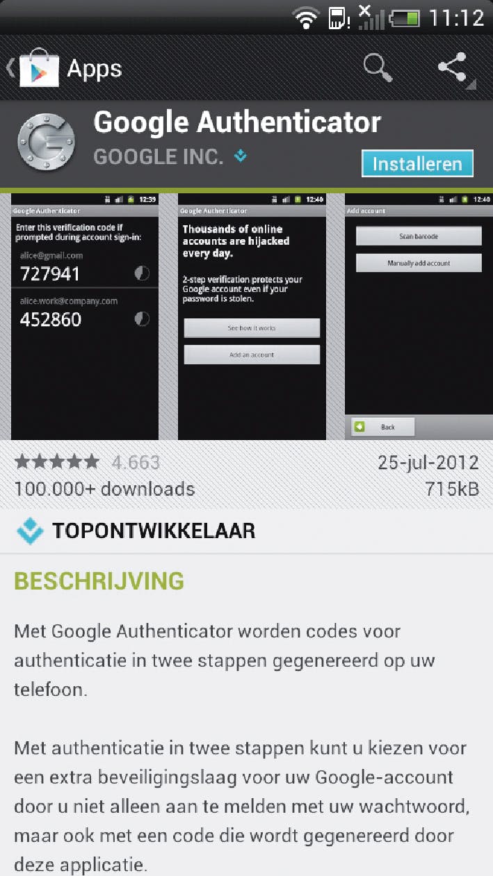Een mooiere oplossing dan verificatiecodes ontvangen via sms is de Google Authenticator, die u zowel op Android, iPhone als BlackBerrry kunt gebruiken. Installeer de app vanuit Google Play (afbeelding 11).