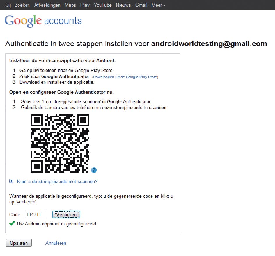 Vervolgens krijgt u een verifcatiecode op uw telefoon te zien, die u onder de barcode op de pc intypt. Klik op de knop Verifiëren om dit te bevestigen. Vervolgens verschijnt de tekst ‘Uw Android-apparaat is gecontroleerd’. Klik op Opslaan. In het instellingenscherm op de pc ziet u nu bij Mobiele applicatie Android en een vinkje verschijnen.