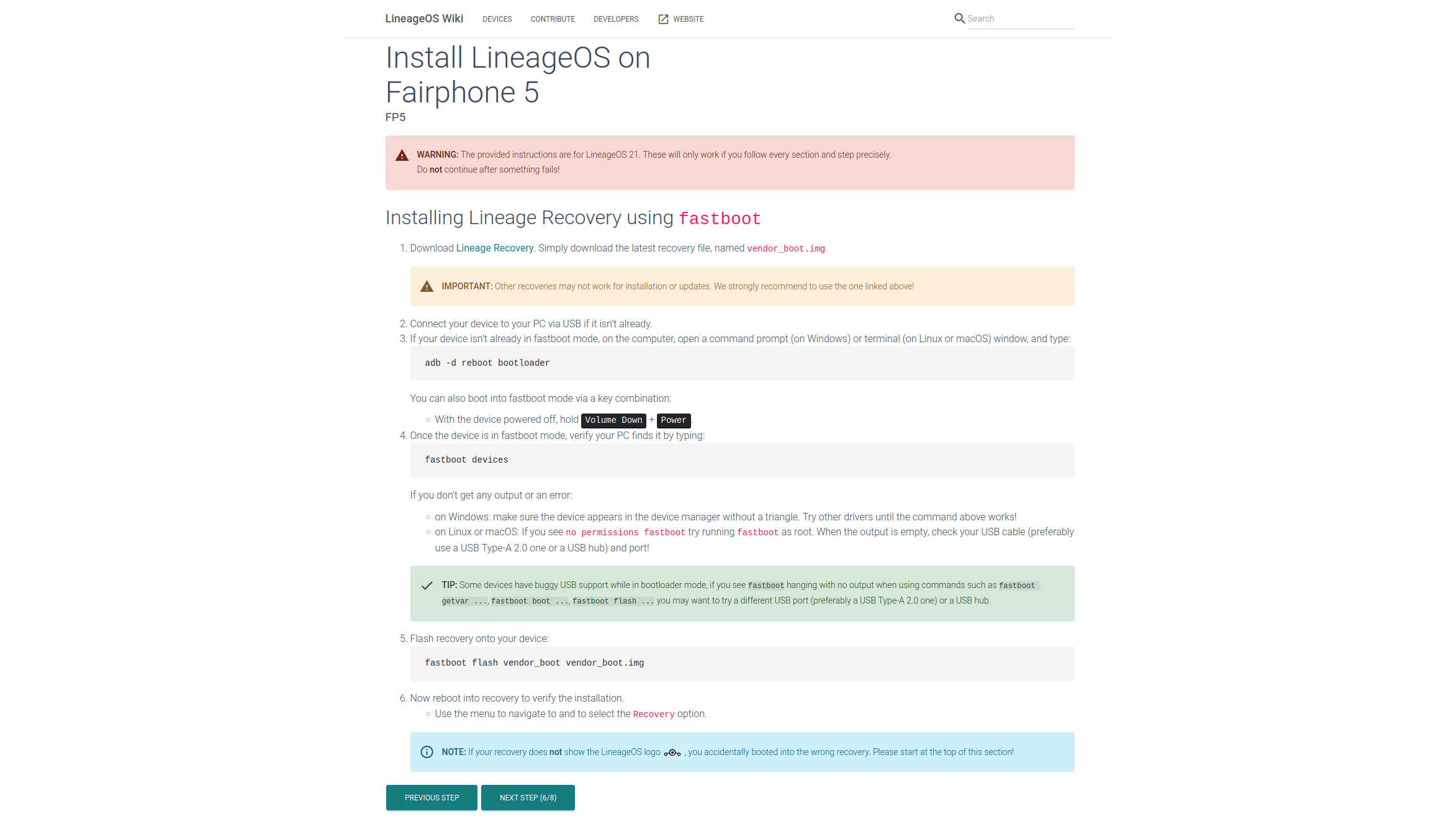 Volg heel nauwgezet alle waarschuwingen en tips in de installatie-instructies van LineageOS.