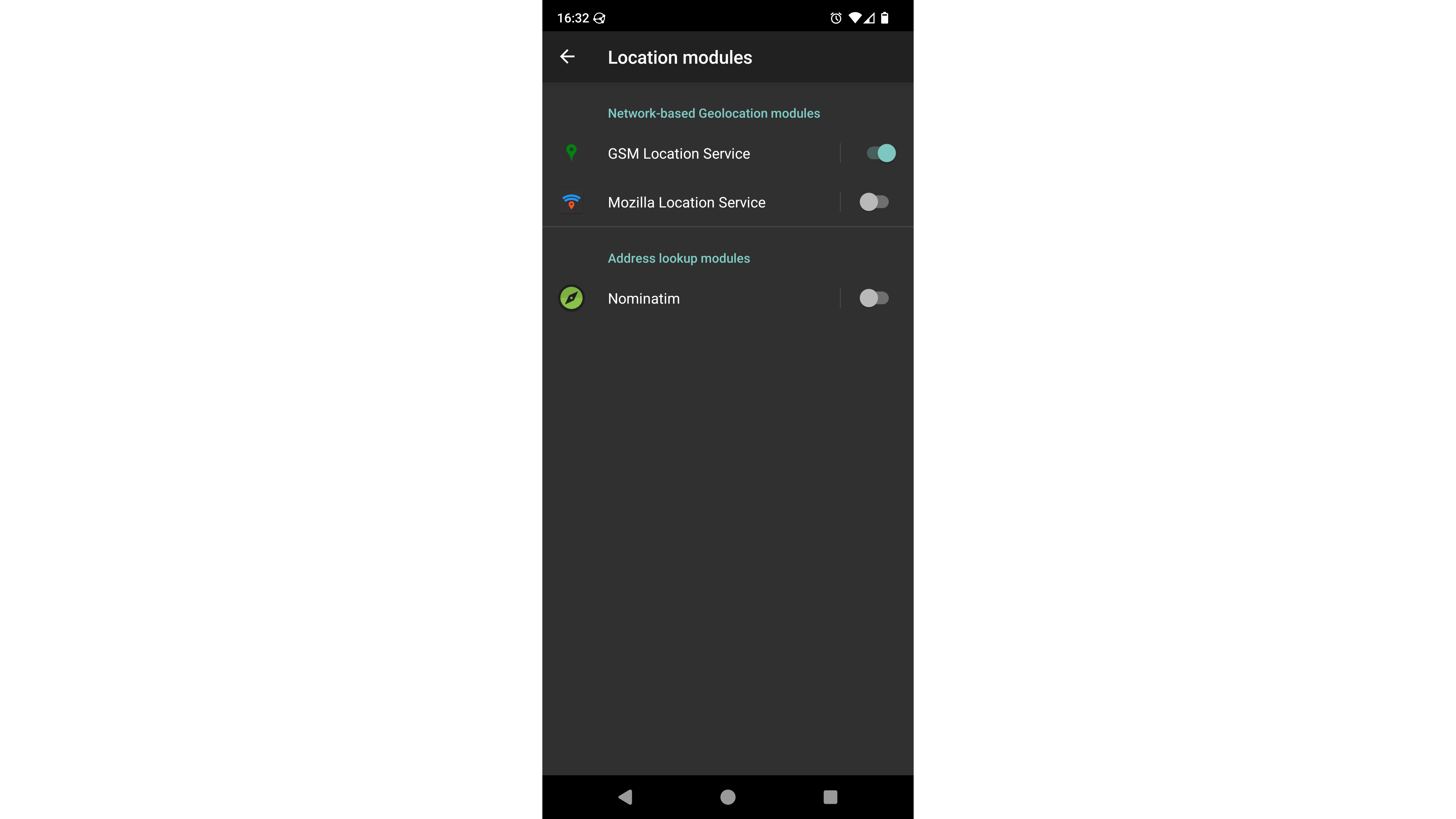 In de instellingen van microG kun je ook hiervoor een alternatief instellen. Tik daarvoor op Location modules. Standaard bood microG één geolocalisatiemodule die op basis van gsm-netwerken en wifi-toegangspunten in de buurt je locatie bepaalt: Mozilla Location Service. Helaas is die dienst inmiddels stopgezet. Je kunt wel de app Local GSM Location installeren en de locatiedienst die ze aanbiedt daarna hier inschakelen.
