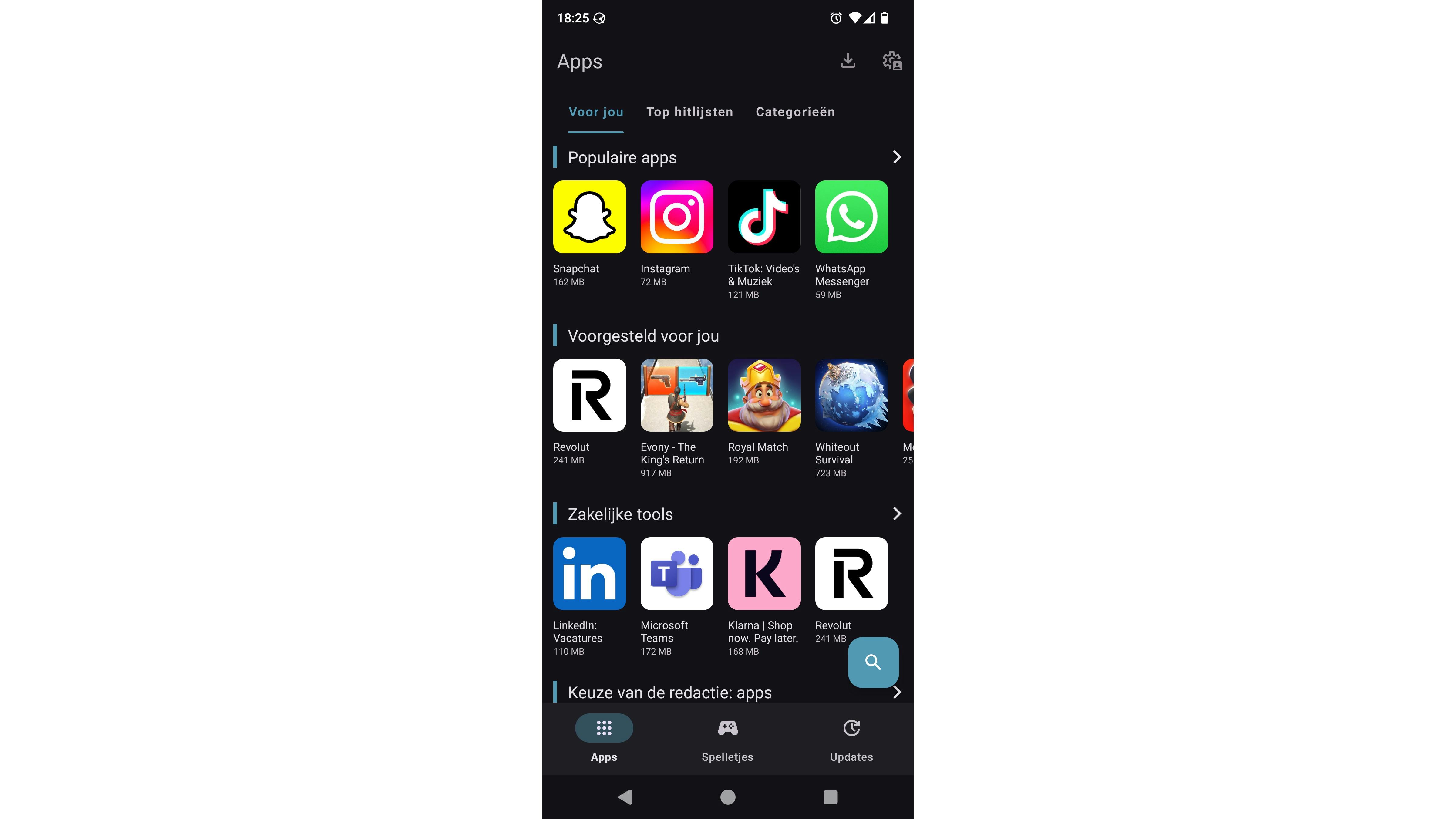 Net zoals in Google Play Store krijg je in Aurora Store apps te zien per categorie, inclusief lijstjes met de populairste apps of apps die voor jou zijn aangeraden. De mogelijkheden zijn minder uitgebreid dan met Google Play Store. Zo kun je geen betaalde apps downloaden of updaten. Bovendien werken heel wat in-app-functies van allerlei apps niet wanneer je Aurora Store anoniem gebruikt. Soms krijg je bepaalde apps ook niet te zien, omdat het anonieme account dat je op dat moment gebruikt van een bepaald land is waar de app niet is toegelaten. Tik in dat geval bovenaan rechts op het tandwiel, dan op Manage your account / Log uit en log weer in als Anoniem. Je krijgt dan een willekeurig ander anoniem account en kunt opnieuw proberen of je de gewenste app vindt.