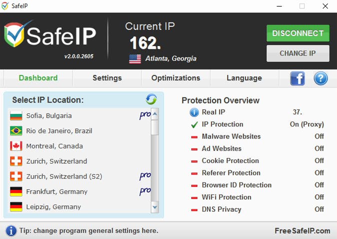 In het tabblad Optimizations kun je het programma optimaliseren voor anoniem browsen (standaard actief) of media streamen. De optimalisatie voor anonieme torrents is alleen beschikbaar als je een SafeIP Pro-abonnement hebt (vanaf 9 dollar voor drie maanden).