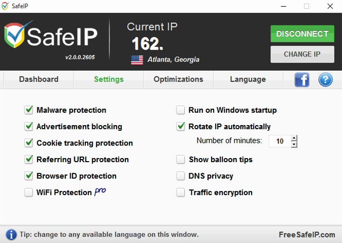 Het is altijd goed om programma's die veiligheid en anonimiteit pretenderen te bieden met een gezonde dosis argwaan te gebruiken, zeker als ze gratis zijn. Bij SafeIP lijkt alles in orde, maar toch raden we aan om het programma niet automatisch te laten starten. De belangrijkste reden hiervoor is de snelheid. Als je anoniem internet via de SafeIP-oplossing werkt dit altijd langzamer dan wanneer je SafeIP niet gebruikt. Open de instellingen van SafeIP en kijk bij Settings. Zorg ervoor dat de optie Run at Windows startup niet actief is. Start SafeIP handmatig zodra je het programma nodig hebt.