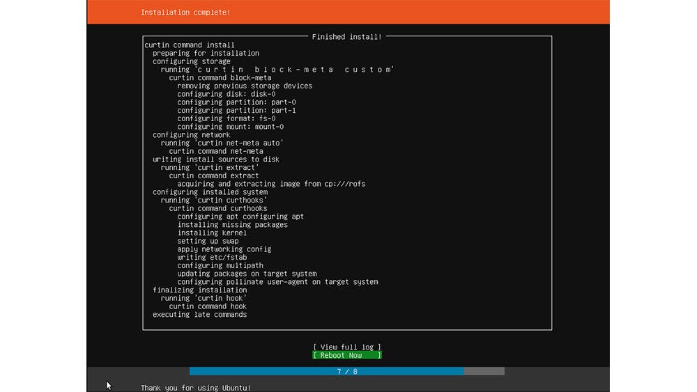 De installatie verloopt vergelijkbaar aan die van Ubuntu Desktop, maar zonder grafische interface: in plaats daarvan worden de stappen in opeenvolgende tekstvensters getoond. Kies je toetsenbordindeling en selecteer dan Install Ubuntu. Daarna wordt normaal automatisch een netwerkverbinding opgezet als je dhcp in je netwerk gebruikt. In de stap erna kies je je opslag. Selecteer Use An Entire Disk en kies de schijf waarop je Ubuntu wilt installeren. Bevestig de voorgestelde partitionering (standaard gebruikt Ubuntu het bestandssysteem ext4, wat prima is voor de opstartschijf) met Done en bevestig nog eens met Continue. Daarna wordt de gekozen schijf gewist en begint de installatie.