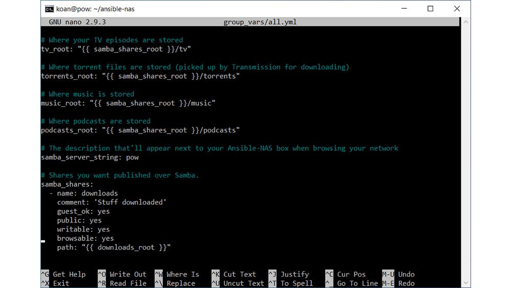 Onder Samba staat de configuratie van je bestandsdeling. Hier stel je het pad in waaronder al je bestanden komen te staan die je wilt delen. Daaronder definieert Ansible-NAS allerlei submappen voor je downloads, films, series, torrents, muziek, podcasts enzovoort. Voor elk van die shares kun je instellen of ze publiek beschikbaar zijn en dergelijke.
