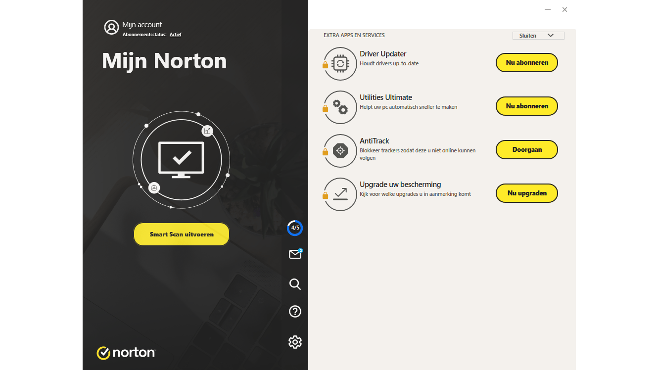 Behalve Norton Antivirus zijn er drie smaken Norton 360: Standard, Deluxe en Premium. Het verschil zit ’m niet in de antivirus en antiransomware, maar in aantallen apparaten, wel of geen VPN en de bewaking voor gelekte privégegevens. Waren de Norton-programma’s enkele jaren geleden nog heel overzichtelijk en zakelijk, inmiddels zijn ze dat niet meer. Net als bij McAfee schakel je tussen programma’s en onlinediensten en bij Norton ook nog tussen Engels en Nederlands. En alsof dat niet genoeg is, begint het nu ook met reclames voor aanvullende producten, zoals Norton Driver Updater, Utilities en Antitrack. Zelfs enige scareware dat het systeem zonder deze extra’s niet optimaal presteert, is aanwezig. Norton 360 is geen slecht beveiligingsproduct, maar de ervaring gaat hiermee wel snel achteruit. Dat we ook na vele weken vragen aan hun pr, nog geen enkel antwoord hebben op onze vragen, past daar wel bij.