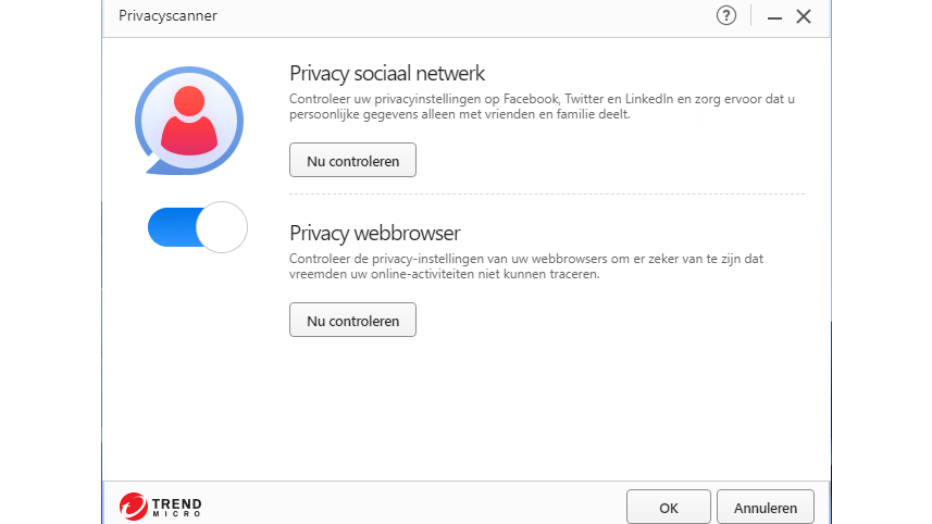 Bij Trend Micro zijn de consumenten en de zakelijke producten al heel lang van elkaar gescheiden en dat resulteert in een wat eigenzinnig antivirusproduct met een beperkte aanvullende functionaliteit. Zo is er wel een privacyscanner, maar deze controleert alleen of de accountinstellingen van Facebook, Twitter en LinkedIn optimaal zijn. De andere sociale media doen niet mee en zoeken naar gelekte informatie is er al helemaal niet bij. Er is een speciale browser voor veilig online betalen, maar die opent niet als je naar een banksite gaat. Dat moet je zelf doen. Om gegevens tegen ransomware te beschermen, moet de gebruiker zelf specifieke mappen aanwijzen die extra bewaakt moeten worden.