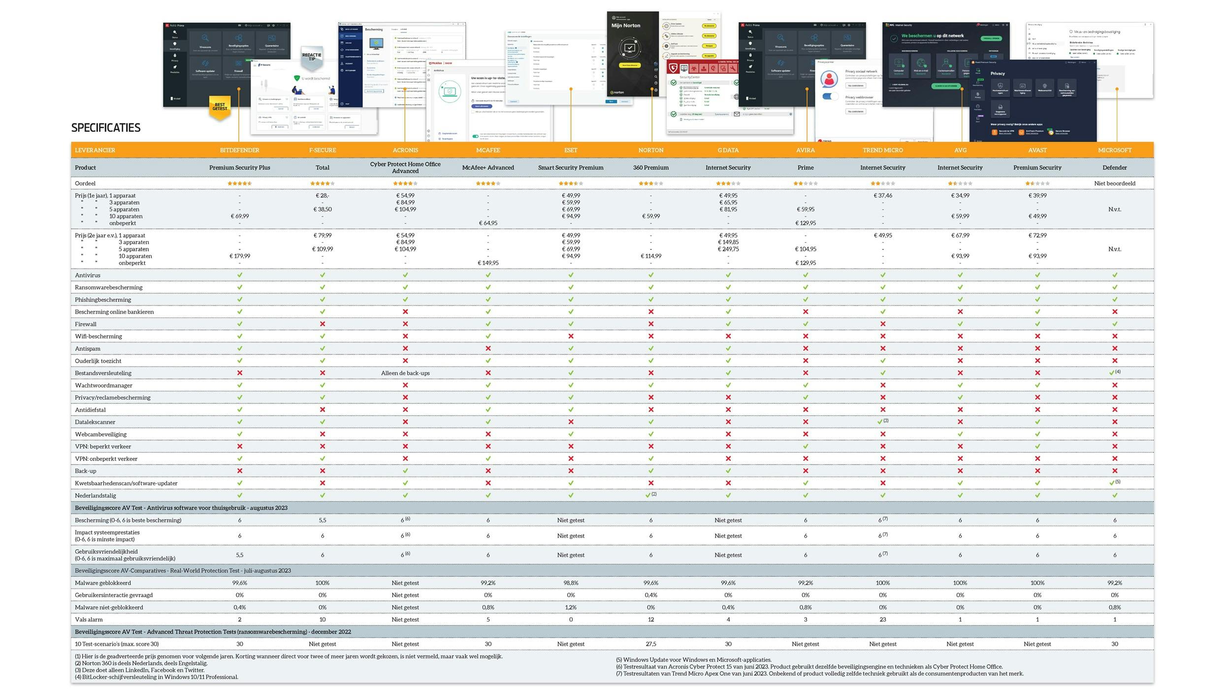 Alle geteste pakketten hebben we gebruikt en beoordeeld op functionaliteit en gebruiksgemak. Elke leverancier in deze test biedt meerdere beveiligingssuites met verschillende functionaliteit. Per leverancier hebben wij het product getest met de meeste securityfuncties. Had een ander pakket wel meer functionaliteit, maar niet specifiek voor beveiliging (bijvoorbeeld systeemoptimalisatie), dan is het minder uitgebreide pakket beoordeeld. VPN is hierbij buiten beschouwing gelaten. Ter vergelijking hebben we ook Windows Defender in de tabel opgenomen.