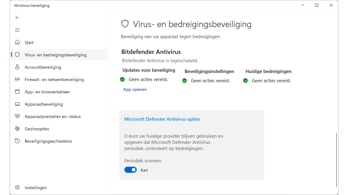 Windows Defender als achterwacht Waar normaal geldt dat je niet twee antivirusoplossingen tegelijk moet installeren, kan dat in combinatie met Microsoft Defender wel. Het product draagt de bescherming tegen virussen en malware netjes over aan het nieuwe antivirusprogramma, maar kan desgewenst periodiek ook zelf nog eens scannen. Twee zien en weten tenslotte meer dan één.