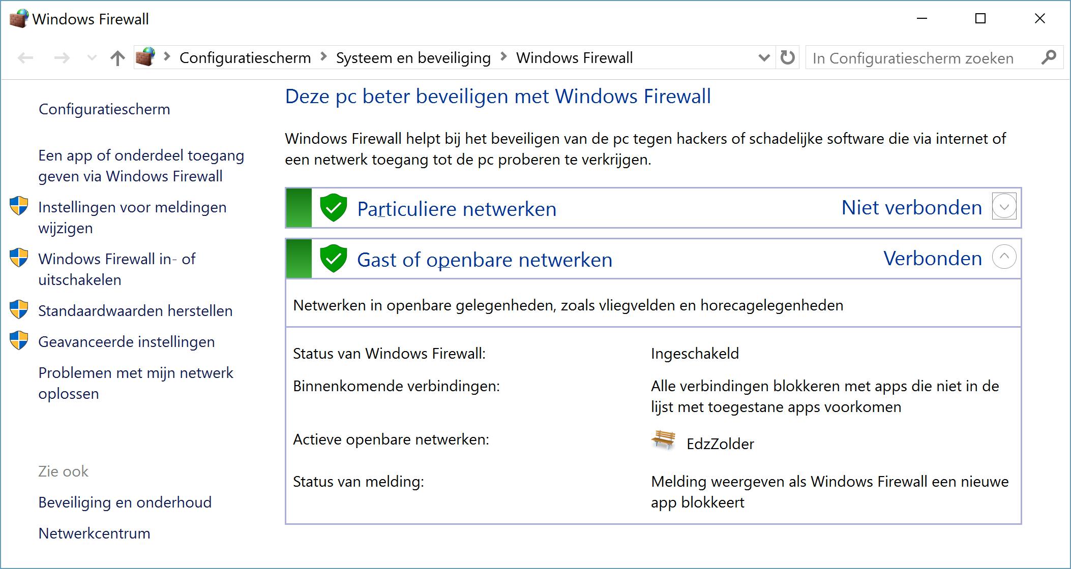 Jarenlang was de ‘echte firewall’ het belangrijkste argument om niet voor ‘alleen’ een antivirusprogramma te kiezen maar een heel beveiligingspakket te willen. Met Windows 10 is de noodzaak hiervan opnieuw kleiner geworden. Windows Firewall biedt goede beveiliging en voldoende functionaliteit, en heeft bovendien nauwelijks aandacht nodig. Zo maakt de firewall onderscheid tussen private en openbare netwerken, en is hij daarbij slim genoeg om een onbeveiligd wifi-netwerk altijd als openbaar te behandelen, zelfs als het je eigen wifi-netwerk is.