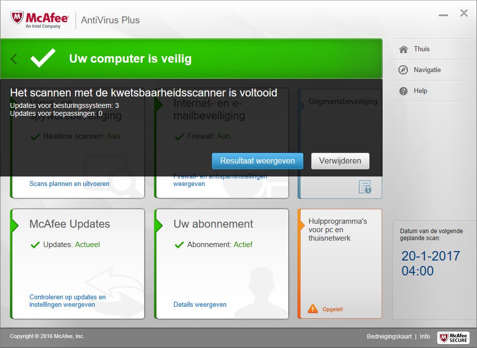 Het zit McAfee niet echt mee. Heeft het net de overgang naar Intel Security afgerond, moet het weer op eigen benen staan. De merknaam McAfee prijkt gelukkig nog nadrukkelijk op alle verpakkingen. Ondanks de ondersteuning vanuit technologie-gigant Intel, is het McAfee nooit gelukt een leidersrol te veroveren. Die leidersrol weet het ook niet te pakken in de tests van het onafhankelijke AV-Test, die hiervoor de Internet Security-variant testte. Net geen maximale score op herkenning en systeemimpact, wel op de algehele bruikbaarheid van de pc. Twee keer werd een programma onterecht als malware aangemerkt. Toch is McAfee hoopvol. De nieuwe versie van Antivirus Plus beschikt namelijk over een nieuwe scan-engine die cloud- en handtekeningherkenning combineert, en zo de herkenning van zowel bekende virussen en zero-days moet verbeteren. We zijn benieuwd naar de volgende resultaten met de nieuwe engine.