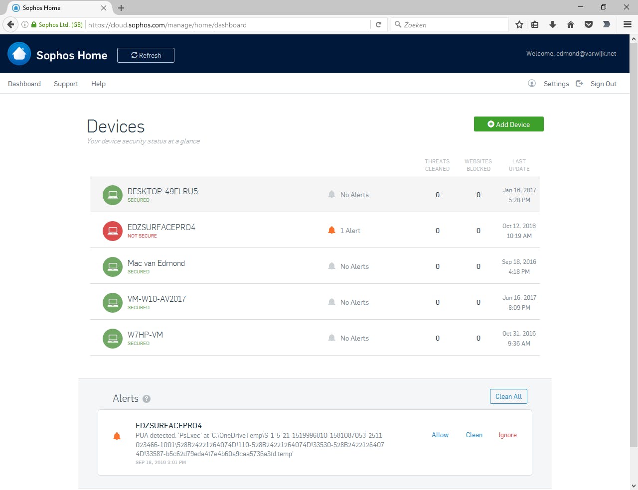 Sophos verkoopt zijn producten alleen aan bedrijven, maar biedt consumenten wel de mogelijkheid tien pc’s en Macs te beschermen tegen malware, onbetrouwbare websites en potentieel gevaarlijke programma’s. Via de zeer goed uitgevoerde webportal kun je de beveiliging controleren en deels ook configureren. Een nadeel: Sophos Home is Engelstalig. AV-Test rekent Sophos tot de antimalwareprogramma’s voor bedrijven en test een hele andere versie dan deze Sophos Home. Die scores zijn wat de beveiliging betreft redelijk, en vooral bij de impact op de pc niet goed. Bij onze test van Sophos Home werd die indruk niet bevestigd. Sophos Home is voor thuisgebruik dan ook zeker geen slechte keuze als je geen geld wilt uitgeven.