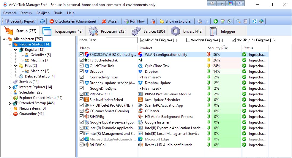 De hoofdwerkbalk is verdeeld in zes tabbladen die de verschillende functies weergeven waarmee Anvir Task Manager Free zich nuttig maakt: Startup, Toepassingen, Processen, Services, Drivers en Inloggen. De tool maakt het je heel makkelijk om het opstartproces van je pc in de gaten te houden. Met een klik op Startup krijg je de lijst met toepassingen te zien die in actie komen als je de pc aanzet. Erachter zie je meteen staan in welke mate ze een veiligheidsrisico vormen en indien nodig kun je ze meteen uitschakelen.