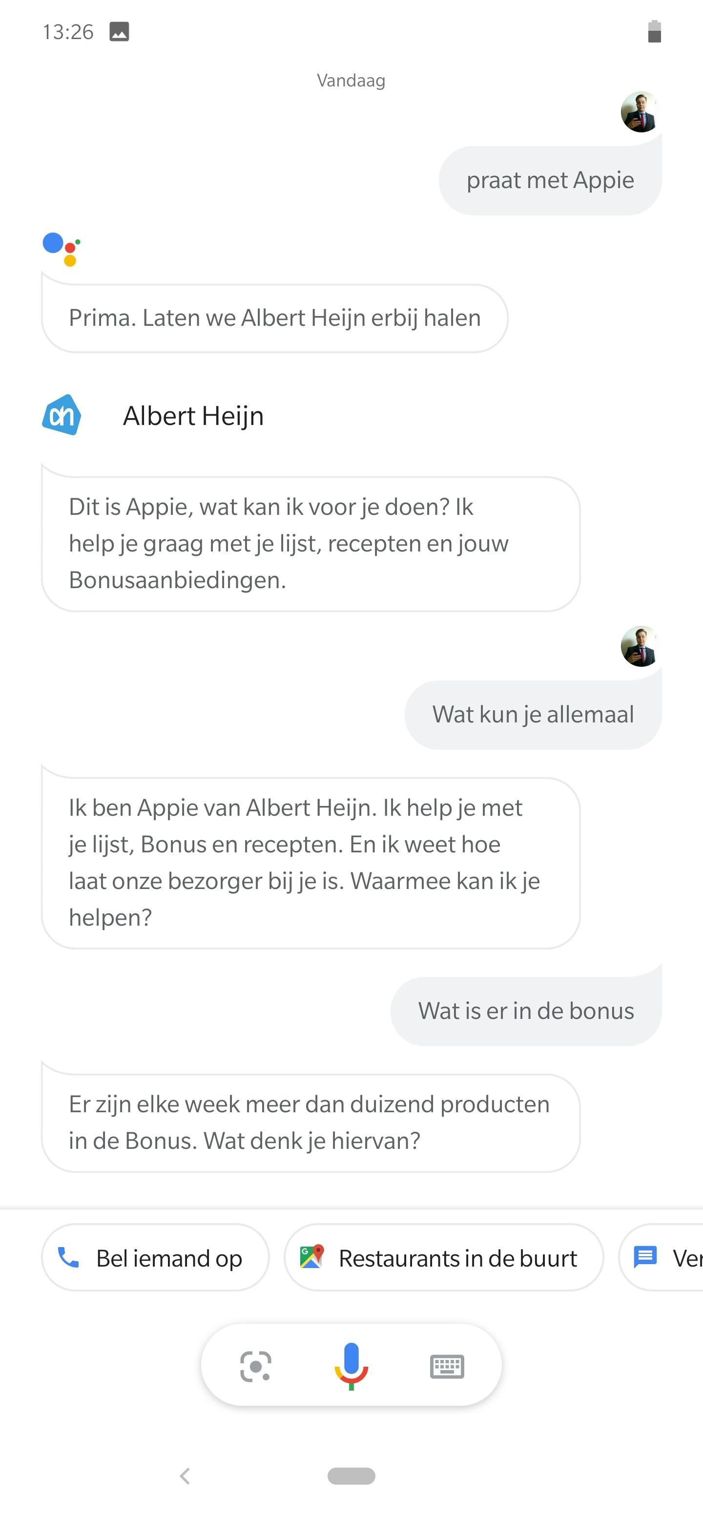 Zo kun je voortaan bijvoorbeeld zeggen dat Appie iets aan je boodschappenlijst moet toevoegen. Eerst zeg je ‘Hey Google, praat met Appie’. Als Appie zich dan meldt, kun je direct je boodschap toevoegen: ‘Voeg havermelk toe aan de lijst’. Mocht je online een bestelling geplaatst hebben, dan is het tevens mogelijk te vragen hoe laat de bezorger op de stoep staat.