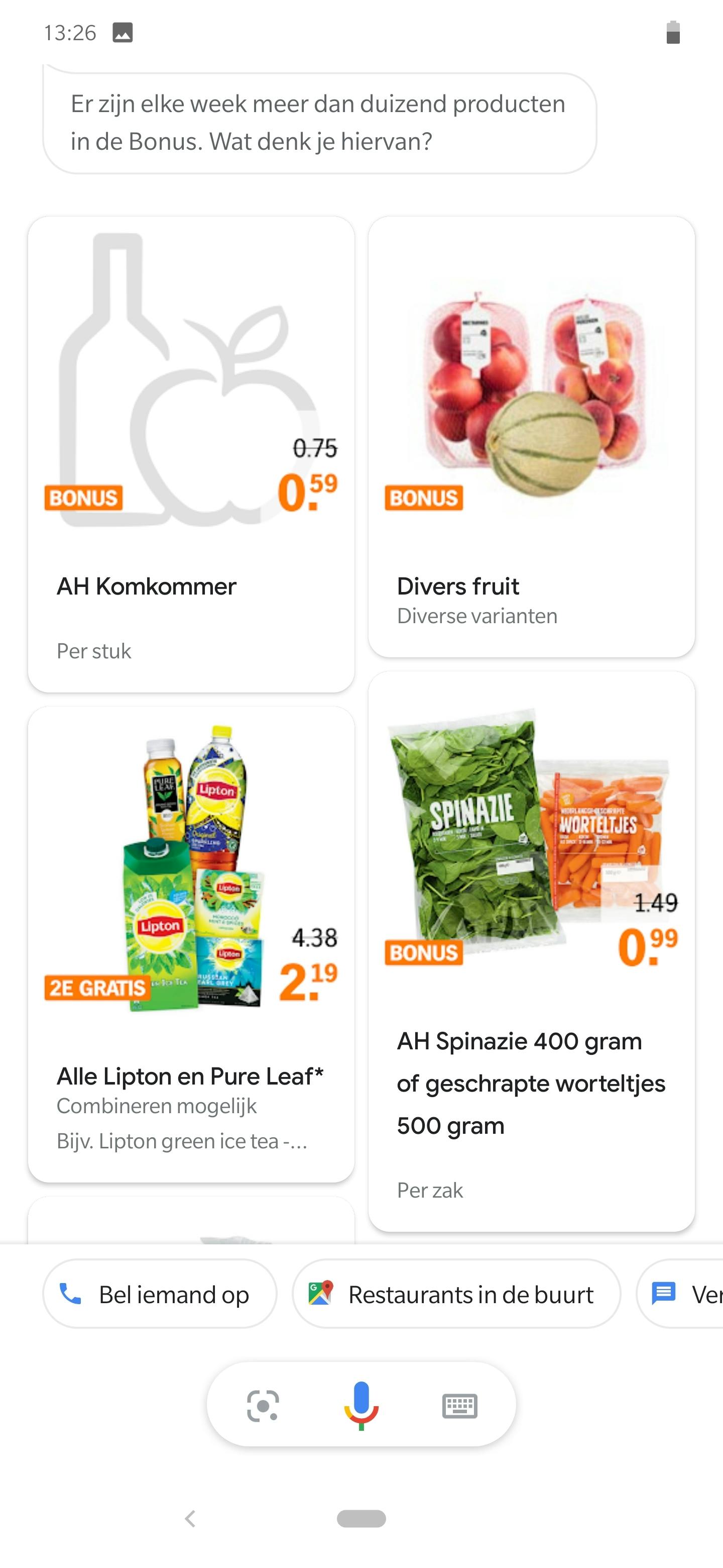 Appie activeren is kinderspel. Het enige wat je hiervoor hoeft te doen is het commando ‘Hey Google, praat met Appie’ uit te spreken. Vervolgens kun je vragen wat er in de aanbieding is. Ook kun je meteen recepten opvragen, waarna de Google Assistant haar best doet met het vertellen over de ingrediënten en de benodigde stappen. Spreek je Appie aan via je je mobiele telefoon of smart display, dan krijg je ook knoppen onder aan het gesprek te zien die je meteen verder kunnen helpen met een volgende vraag of stap. Doe je dit via een speaker, zoals een Sonos One of Google Home, dan moet je alles zo duidelijk mogelijk uitspreken.