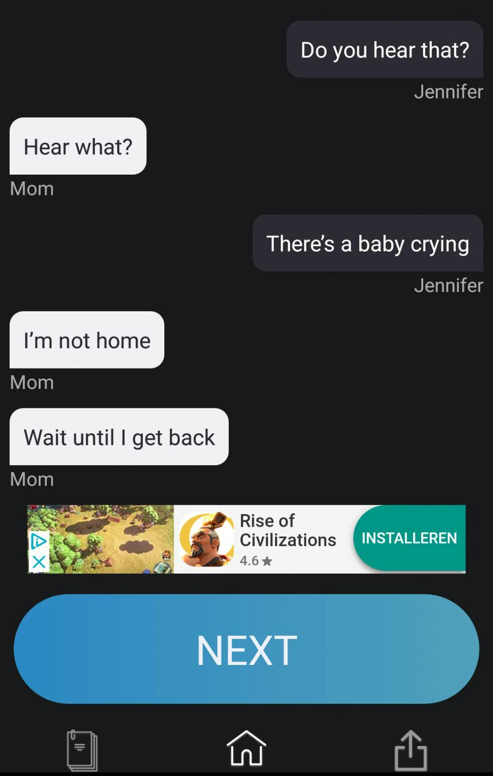 Gripped is gebaseerd op appgesprekken met een spannende wending. Deze gesprekken vormen een kort verhaal dat stukje bij beetje aan je wordt onthuld. Wat wel een beetje jammer is, is dat wanneer je midden in het verhaal zit, advertenties ertussendoor geblaat komen.