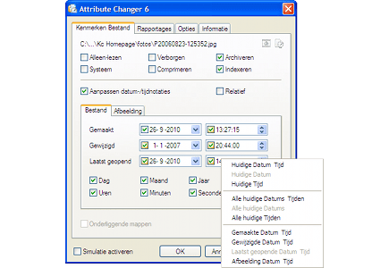 Selecteer in de Verkenner de bestanden of mappen waarvan u de eigenschappen wilt wijzigen. U kunt ook de eigenschappen van alle bestanden binnen een map, of van een bepaalde selectie bestanden of mappen laten aanpassen. Daarna is deze selectie met filters eventueel nog verder in te perken. Met een vinkje geeft u aan of submappen meegenomen moeten worden. Handig is dat u bij het aanpassen van datum of tijd (gemaakt, gewijzigd, laatst geopend) met relatieve waardes mag werken, zoals -7 dagen of +12 uur. Om zeker te weten dat de eigenschappen juist gewijzigd worden, zit er een simulatiemodus in het programma. In een rapport worden dan zowel de oude als de nieuwe eigenschappen opgesomd. Zo kunt u rustig sleutelen tot alles naar wens is, om de wijzigingen dan pas aan te brengen.