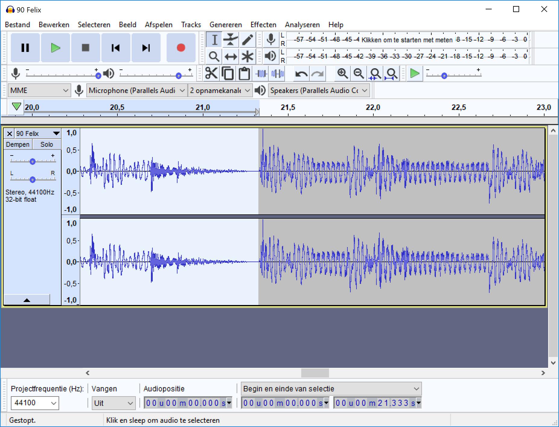 Om een audiobestand harder te maken, zou je gewoon naar Effecten kunnen gaan en hier voor Versterken kunnen kiezen. Door de schuif naar rechts te bewegen, wordt het bestand luider zodra je op OK klikt. Het probleem is echter dat je niet weet hoeveel decibel je het bestand kunt versterken voordat bepaalde delen gaan oversturen. Het is daarom beter om de optie Normaliseren bij Effecten te gebruiken. Dit effect zoekt het hardste punt in het bestand op en baseert hierop hoeveel decibel het bestand kan worden versterkt. Zo weet je zeker dat een bestand nooit overstuurt en dus kraakjes, distortion en fuzz-geluiden zal gaan genereren. Zorg dat je bij Maximum amplitude normaliseren naar nooit hoger dan 0 dB gaat. Normaliseren werkt niet goed als een bestand heel stille passages heeft én heel harde stukken kent. Het stille gedeelte zal nu namelijk bijna niet versterkt worden. In dit geval kun je beter een stil stuk selecteren en alleen dit gedeelte normaliseren of versterken.