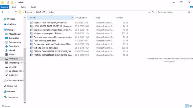 Eén manier om woorden te tellen in meerdere documenten is het handige programmaatje AnyCount, maar daarvoor betaal je wel gelijk 49 euro. Gratis software raden we af, omdat er op dit gebied opvallend veel programma's zijn die allerlei rotzooi op je pc installeren. Een veilige gratis manier, is door zelf een macro te maken in Word. Voordat we hiermee aan de slag gaan, dien je eerst de documenten waarvan je de woorden wilt tellen in één map te zetten. Ter illustratie gebruiken wij de map C:\tellen.