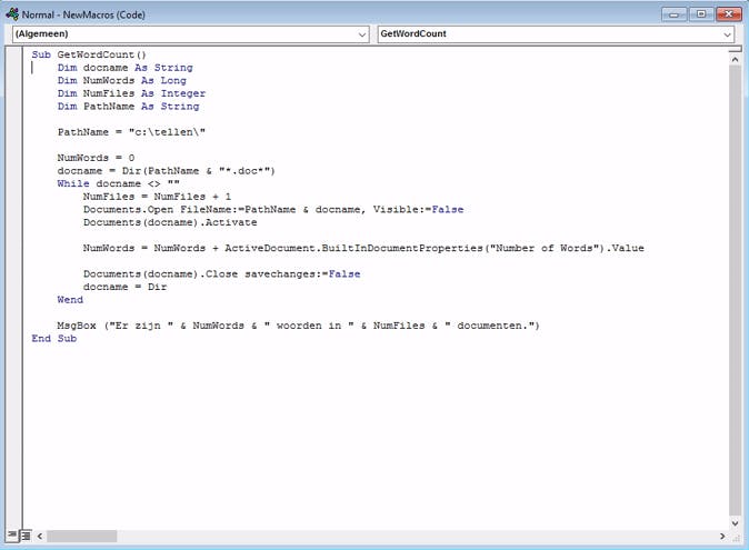 Wanneer je nu de macro uitvoert, zie je binnen een paar tellen het woordtotaal.