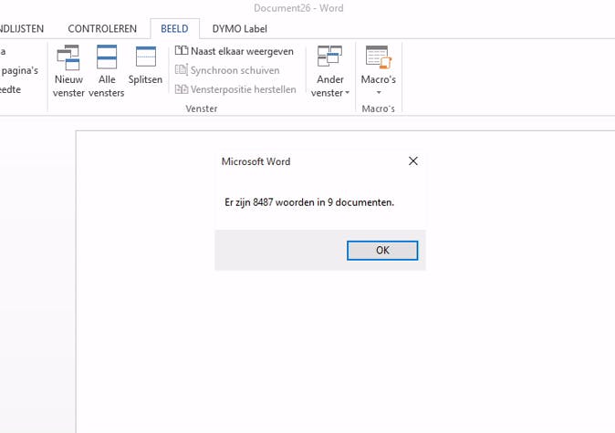 Nu je de macro hebt gemaakt, kun je deze heel eenvoudig toepassen. Klik wederom op Beeld > Macro's > Macro's weergeven en selecteer je macro. Klik nu op Uitvoeren. Word gaat direct aan de slag en afhankelijk van de hoeveelheid documenten, zie je binnen een paar seconden hoeveel woorden alle documenten samen bevatten.