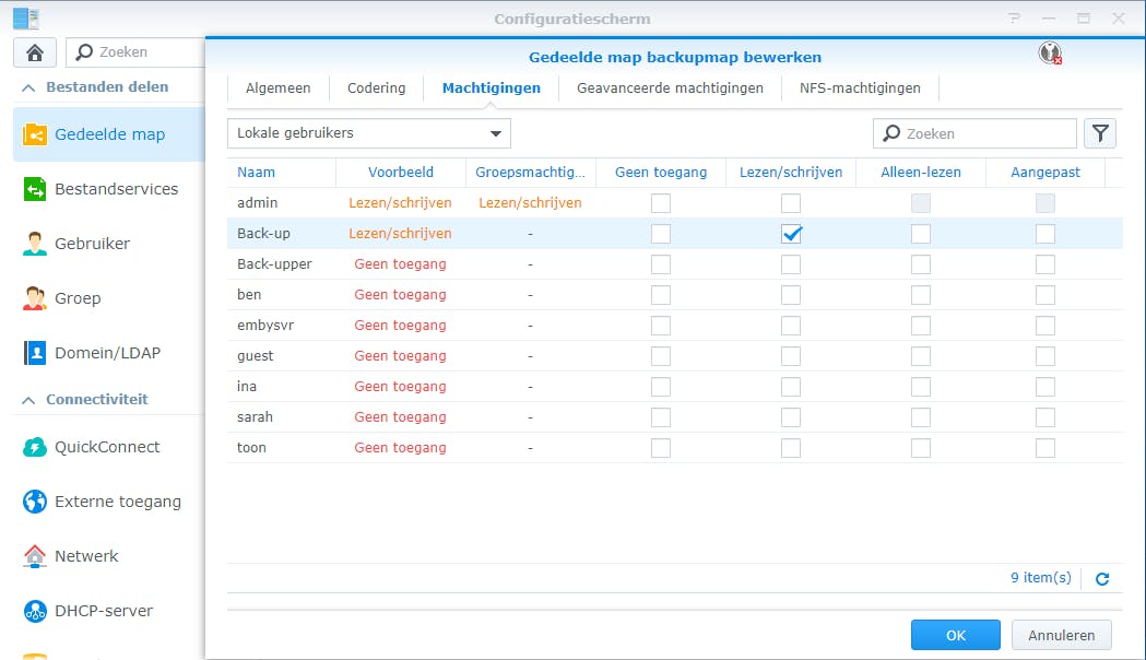 In de rubriek Gebruiker van het Configuratiescherm klik je op Maken en creëer je een nieuwe gebruiker (bijvoorbeeld Back-up). Voorzie een wachtwoord en klik viermaal op Volgende tot je bij het venster Toepassingsmachtigingen toewijzen terechtkomt. Plaats een vinkje bij FTP in de kolom Toestaan, druk nog tweemaal op Volgende en op Toepassen.