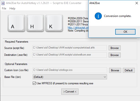 Een gecompileerd ahk-script kun je probleemloos aan andere gebruikers doorgeven: die kunnen het dan ook uitvoeren zonder zelfs AutoHotkey nodig te hebben. Immers, de AutoHotkey-interpreter wordt in het exe-bestand gestopt. Leuk is ook dat je je eigen pictogram aan zo’n programma kunt koppelen. Open daartoe de programmagroep AutoHotkey en kies Convert .ahk to .exe. Via Browse verwijs je zowel naar het bronscript als naar het uitvoerpad. Met de onderste Browse-knop koppel je er dan een specifiek ico-bestand aan. Met Convert compileer je het script.