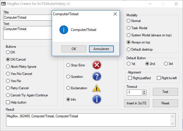 Wil je tekst in een pop-upvenster (zoals ‘MsgBox, Hallo wereld’ uit stap 3) laten verschijnen, dan kun je gebruikmaken van het knopje MsgBox Creator in Scite4AutoHotkey. Er verschijnt dan een dialoogvenster waarin je de titel, inhoud, eventuele knoppen en pictogrammen en enkele stijlaspecten kunt aanduiden in een grafische ontwerpomgeving. Heb je alles goed ingesteld, druk dan op de Test-knop en vervolgens op Insert in SciTE. De resulterende coderegel wordt dan in je script geïnjecteerd.