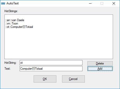 Het feit dat je hier sneltoetsprefixen als ^(Ctrl) en ! (Alt) gebruikt, kan problemen opleveren bij code als ::ctot::Computer!Totaal, gezien het uitroepteken dan niet als leesteken wordt geïnterpreteerd, maar staat voor de Alt-toets. De oplossing is gelukkig eenvoudig: ::ctot::Computer{!}Totaal.