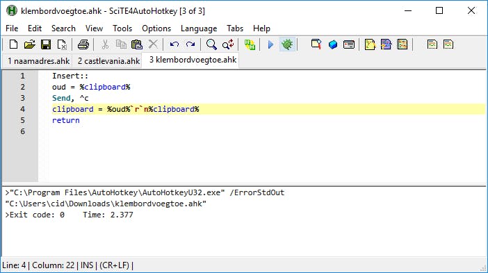 Eerst plaatsen we de actuele inhoud van het klembord in de variabele oud, waarna we bij het indrukken van de Insert-toets de variabele clipboard vervangen door de variabele oud samen met de actuele inhoud van het klembord. Om te vermijden dat de inhoud letterlijk aan elkaar wordt geplakt, voegen we er de code `r`n aan toe: die zorgt ervoor dat het daaropvolgende deel op een nieuwe regel terechtkomt.