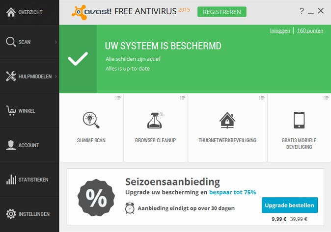 Free Antivirus 2015 van Avast! is een prettige antivirus om gratis je pc te laten beschermen. De interface is overzichtelijk, de druk om te upgraden naar een betaalde versie is beperkt en met de scan van het thuisnetwerk en de browserbescherming biedt het leuke extra's.