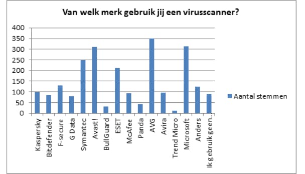 AVG is de populairste leverancier van antivirussoftware: vijftien procent zegt gebruik te maken van deze software. Hieronder valt zowel de gratis als de betaalde versie van de AVG-virusscanner. Opvallend is dat de grote namen een relatief kleine gebruikersgroep hebben, wat erop wijst dat de Nederlander liever voor een gratis pakket kiest. Zo heeft Avast! een aandeel van 13,41 procent en doet Microsoft het ook niet slecht met 13,5 procent.