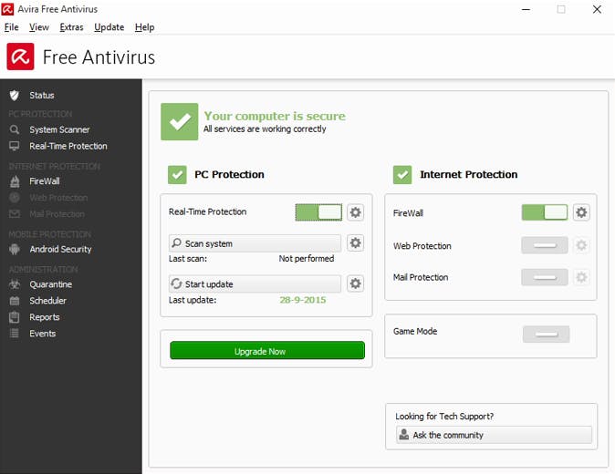 Avira's interface is met veel menu's en lijstjes maar daarmee wel heel rechttoe rechtaan te bedienen. Het lijkt alsof Avria ook een firewall meelevert maar het groene vinkje betekent alleen dat de Windows Firewall is ingeschakeld en volgens Avira "optimaal geconfigureerd". Functies die wel in de betaalde edities zitten, zitten ook in Free Antivirus maar zijn uitgeschakeld. Er wordt niet meteen een webstore geopend en ook verder blijft Avira terughoudend met reclames. Avira gebruikers kunnen een rescure-cd downloaden om het systeem offline te scannen. Avira is Engelstalig.