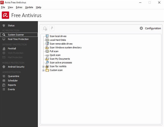 De interface van Avira Free Antivirus is ouderwets maar wel overzichtelijk.