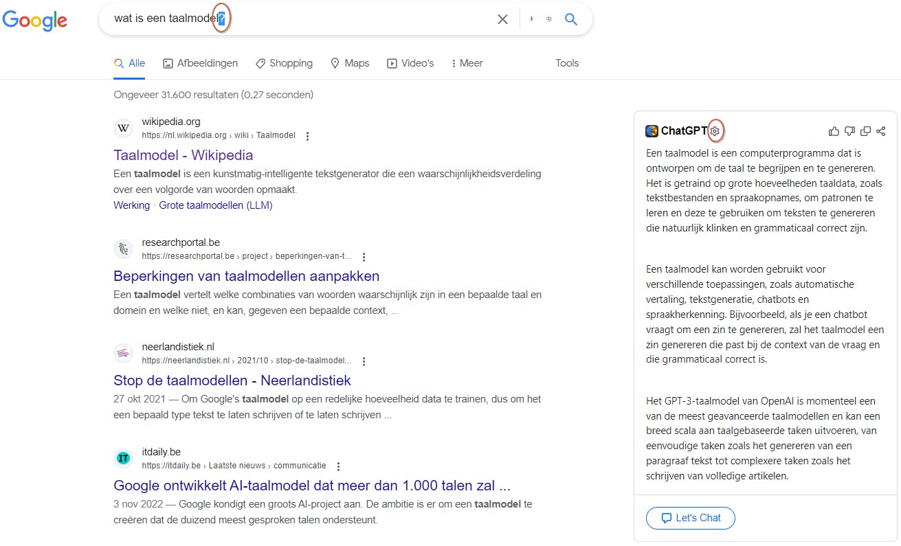 Ben je een trouwe gebruiker van de Google-zoekmachine, dan heb je vast iets aan de extensie ChatGPT for Google (www.chatgpt4google.com; beschikbaar voor Firefox en Chromium-browsers). Na installatie verschijnt rechts van de zoekresultaten in Google een kader met de ChatGPT-respons. Wil je deze alleen ‘op commando’ laten verschijnen, klik dan op het tandwielpictogram in dit kader en selecteer Manually (zodat je eerst op een knop moet drukken) of Question Mark (zodat de respons alleen verschijnt wanneer je je zoekterm met een vraagteken afsluit).