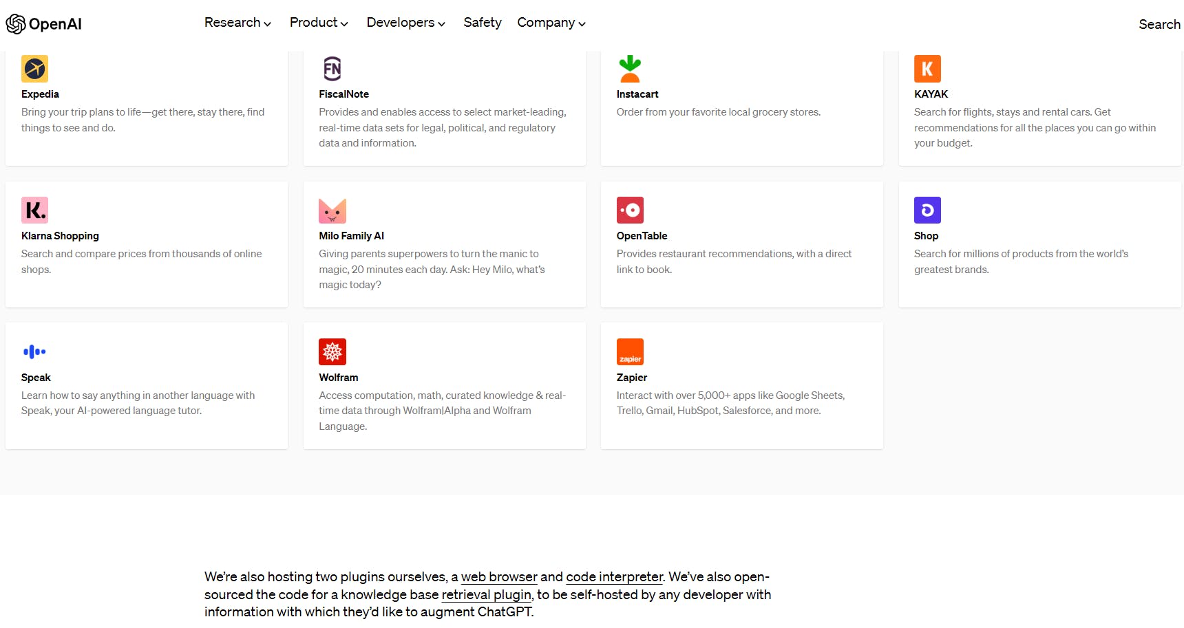 ChatGPT plug-ins Eind maart kondigde OpenAI aan dat ze aan eigen plug-ins voor ChatGPT werken. Inmiddels is er een lange lijst van uiteenlopende plug-ins, van eentje waarmee je actuele data van internet kunt raadplegen tot eentje waarmee je gegenereerde (Python) code in een sandbox kunt laten draaien draaien tot een plug-in waarmee je data uit eigen documenten kunt benaderen. Je vindt hier tevens een overzicht van derde partijen die een eigen plug-in voor ChatGPT hebben ontwikkeld, zoals Expedia, Wolfram en Zapier.