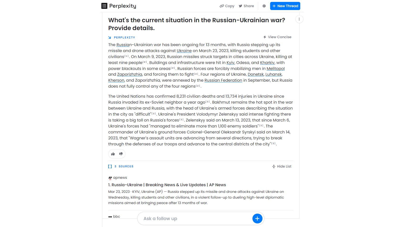 Helemaal onderaan vind je nog de rubriek Related met verwante vragen. Klik op de plusknop achter zo’n vraag om het bijbehorende antwoord te zien. De bot kan de eerder ingetikte vragen en antwoorden onthouden: vul een volgende vraag in bij Ask a follow up om hiermee verder te werken, of druk op de knop +New Thread om een nieuwe vragenronde te starten.