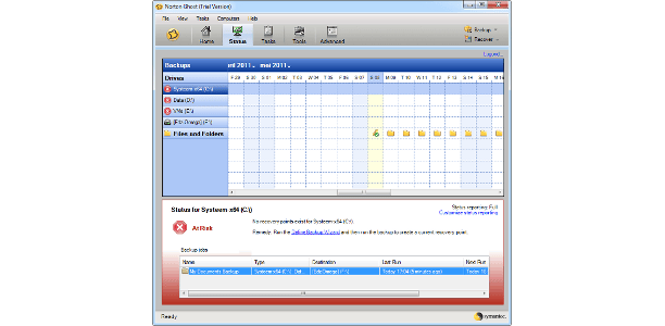 Norton Ghost heeft een verleden als imaging-software, maar kan sinds enkele versies nadrukkelijk ook worden gebruikt voor het back-uppen van gebruikersbestanden. Net als bij Windows Back-up zijn systeemback-up en databack-up in één back-uptaak te verenigen. Na de installatie helpt een wizard de back-ups te configureren. Ghost heeft een duidelijke voorkeur voor opslag op een externe harde schijf. Deze wordt standaard geselecteerd en bij een andere keuze laat het programma een duidelijke waarschuwing zien. Cd, dvd en blu-ray worden wel ondersteund, evenals ftp. Handig om zo de back-up direct via internet op een andere locatie te plaatsen.