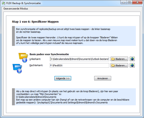 Flex Back-up & Synchronisatie gebruikt in de helpteksten van de wizard, echte voorbeelden van de pc van de gebruiker.