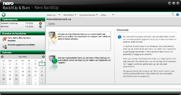 Nero heeft een automatische back-up die alle gegevens veilig opslaat op een externe schijf. Back-ups worden dan elke twee uur uitgevoerd en de laatste van de dag wordt bewaard, evenals de laatste van de week. Wie meer zeggenschap wil, kan bestanden of schijven selecteren en als aparte back-uptaak definiëren. De interface van Nero is, hoewel niet standaard voor Windows, toch zeer bruikbaar. Alle opties komen op het juiste moment. Bovendien zijn er mooie kleine opties zoals het uitschakelen van de pc na de back-up. Nero kan mappen synchroniseren, maar mist daarbij de functierijkdom van de andere synchronisatieprogramma's. Nero doet ook systeemherstel maar niet met de kwaliteit van bijvoorbeeld Acronis True Image. Het kan bijvoorbeeld geen image van het systeem maken anders dan via de reddings-cd.