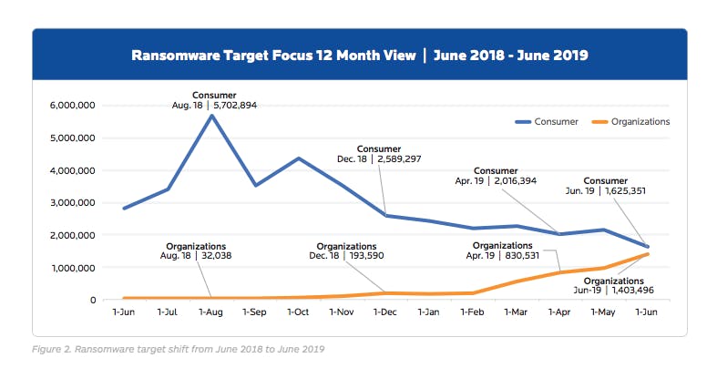 Het verband met individuele ranswomare-aanvallen is in onderstaande grafiek duidelijk zichtbaar. Die piekten rond augustus van 2018 en namen vanaf begin 2019 telkens verder af. En juist daar start de toename op zakelijke aanvallen. De trend komt overeen met de resultaten van andere onderzoekers, waaronder die van Microsoft.